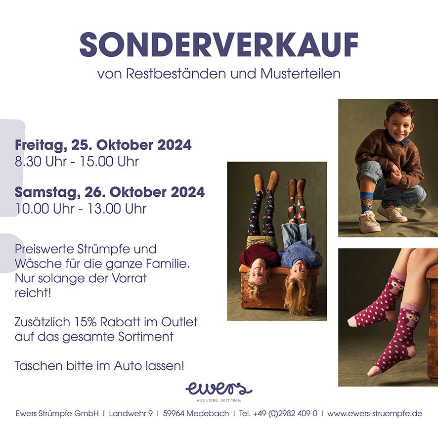 Im EWERS Outlet gibt es Strümpfe und Wäsche für jeden Geschmack. Nicht nur für die Kleinen gibt es hier eine tolle Auswahl, sondern auch Mama und Papa können hier ganz tolle Schnäppchen in hochwertiger Qualität ergattern.